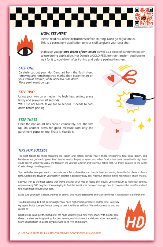 Hot Dang Press is a creative brand that brings playful, craft-forward illustration to customizable art transfers. Hot Dang Press was started by artists Katherine and Ben, beginning as a family craft project that evolved into a business offering ready-to-use iron-on art sheets with original, hand-drawn designs you can apply with just a household iron. The products are designed, printed, and packed in Atlanta, Georgia, and aim to make creative self-expression simple, fun, and accessible for makers of all ages.