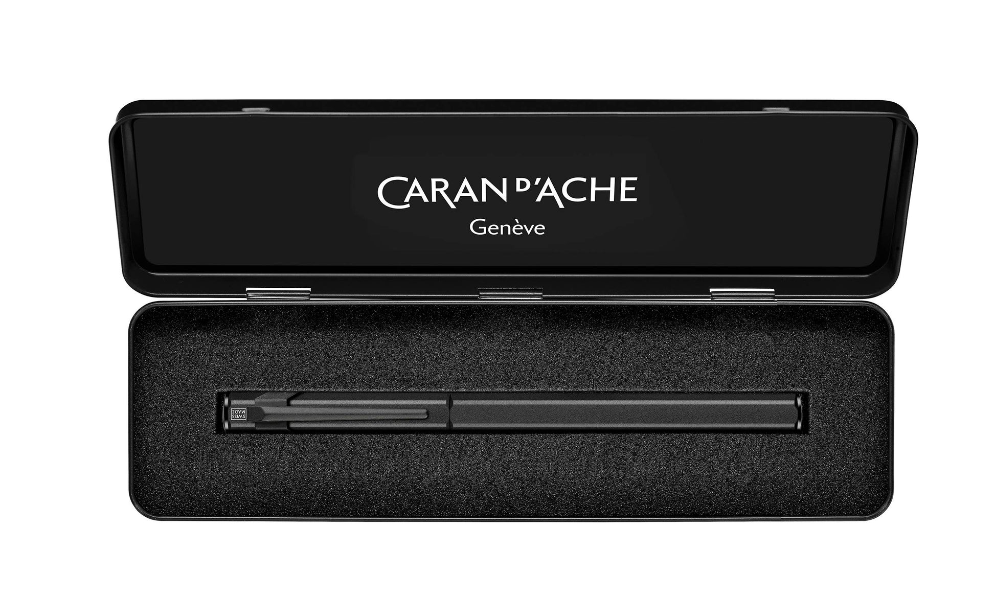 There is one color that stands the test of time and fashion while symbolizing both power and elegance: black. Caran d'Ache is celebrating the timeless essence of this color in its Black Edition collection, consisting of writing instruments in a total monochrome look. The Black Edition collection is a celebration of black, the color that transcends fashions and epochs. RITING INSTRUMENT VERSION Fountain Pen PEN BODY Hexagonal aluminium body and cap, lightweight and durable Black colour and sandblasted shiny finish Glossy black plastic writing block Caran d'Ache isotype engraved on the button Clip and button made of metal with matte black chrome finish Stainless steel nib with black lacquer finish