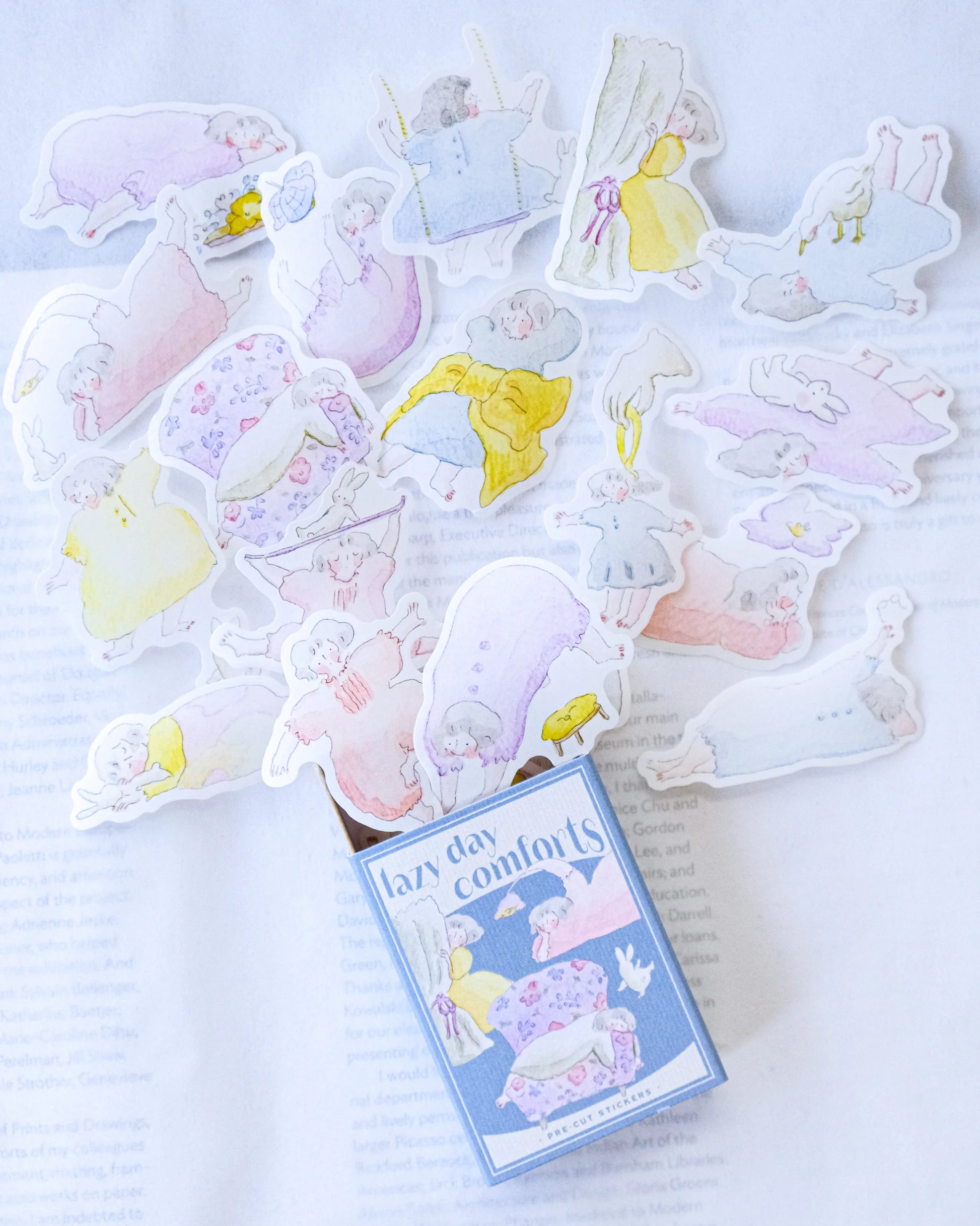 “Lazy Day Comforts” is part of the cozy Matchbox Washi Flake Series by dodolulu! This set features die-cut stickers illustrated in delicate watercolor and colored pencil, capturing gentle, nostalgic moments of comfort. Perfect for journals, planners, scrapbooks, or any paper-craft project, these stickers add a warm and charming touch to your pages.