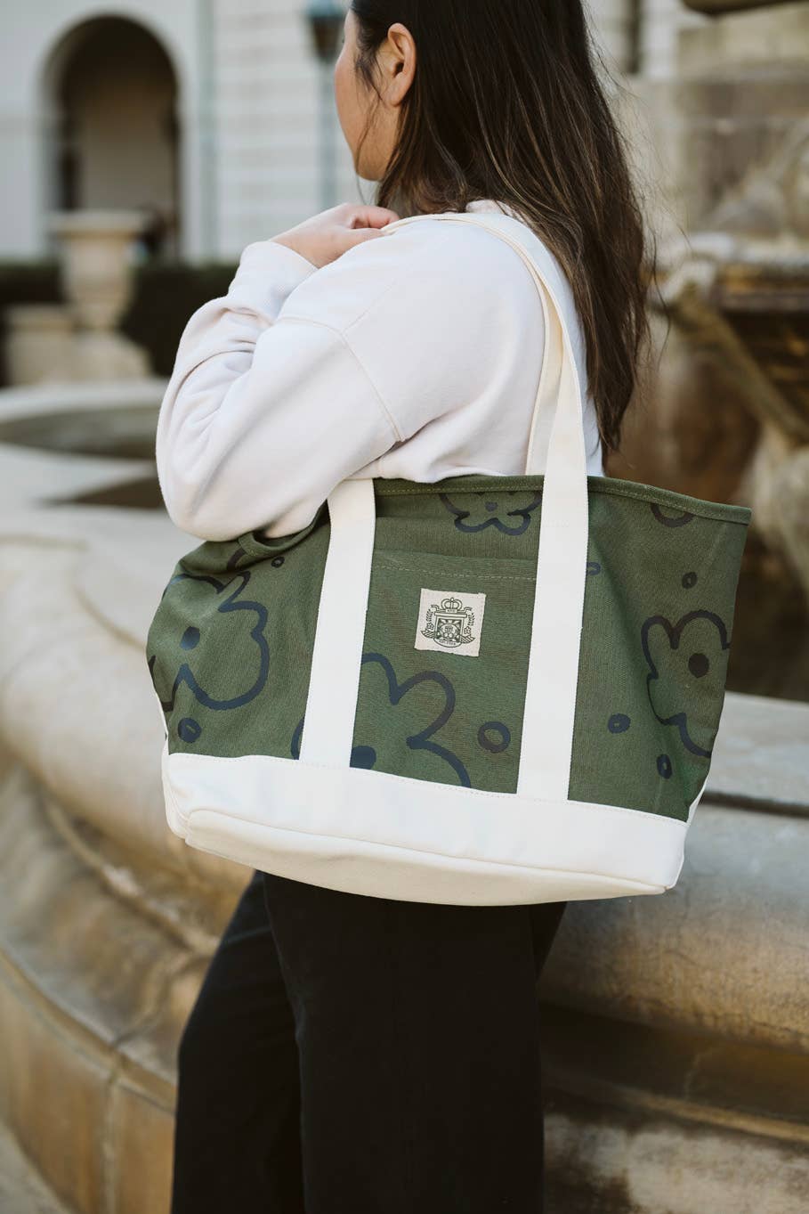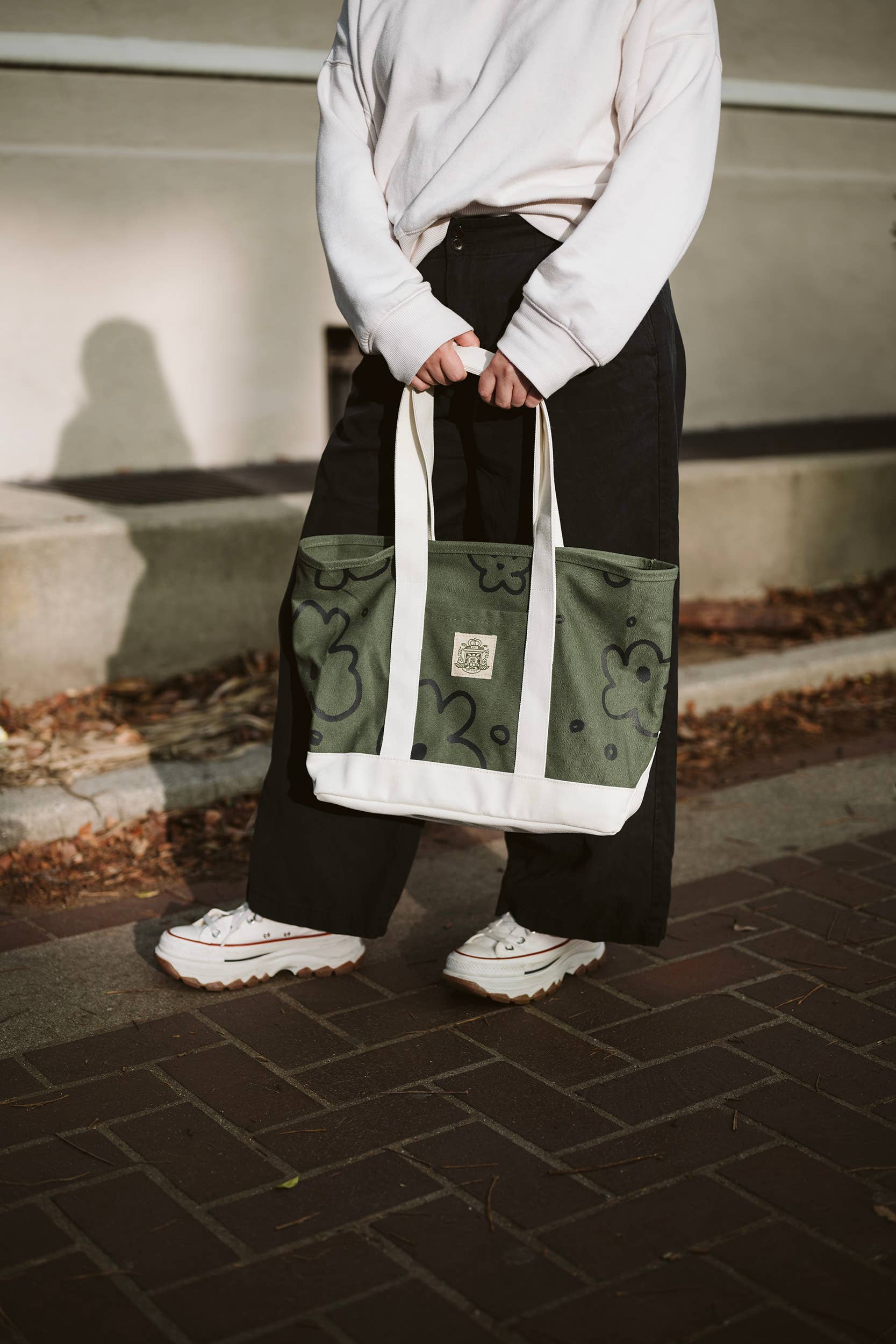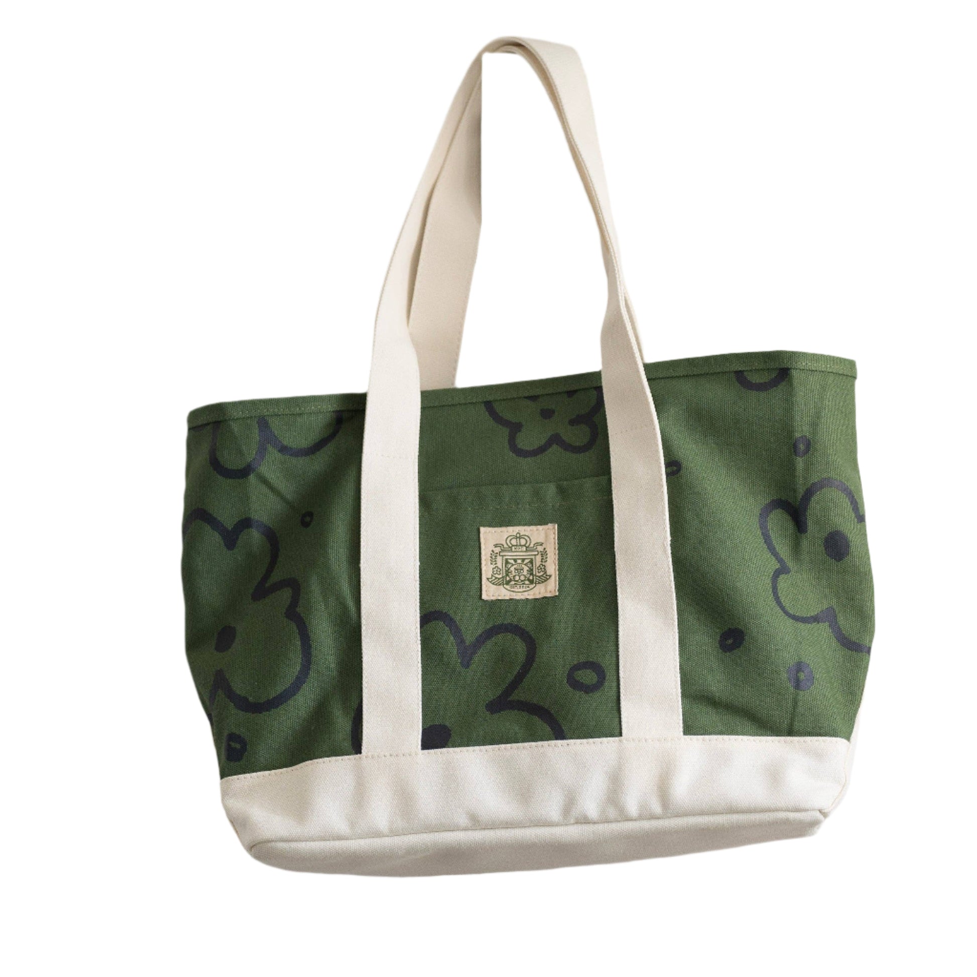A durable everyday tote made from super heavyweight cotton, featuring a bold green flower design. Built to last with a reinforced base, taped seams, and double-layer handles, it’s perfect for errands or daily use. Includes a front cell phone pocket for easy access to essentials. Spot clean only.