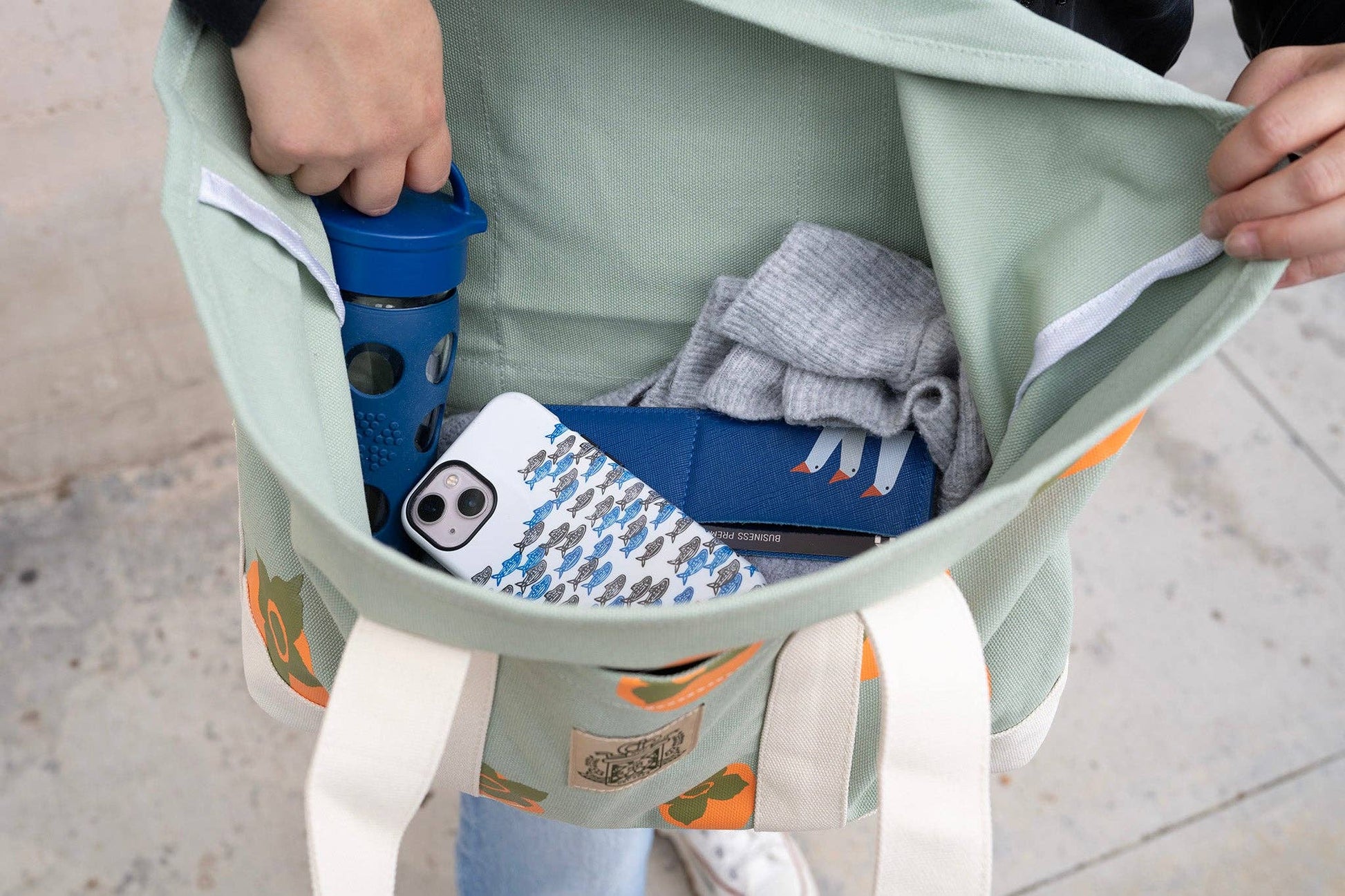 A durable everyday tote made from super heavyweight cotton, featuring persimmons! Built to last with a reinforced base, taped seams, and double-layer handles, it’s perfect for errands or daily use. Includes a front cell phone pocket for easy access to essentials. Spot clean only.