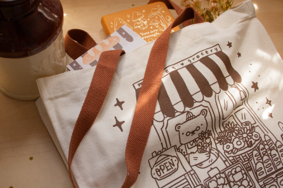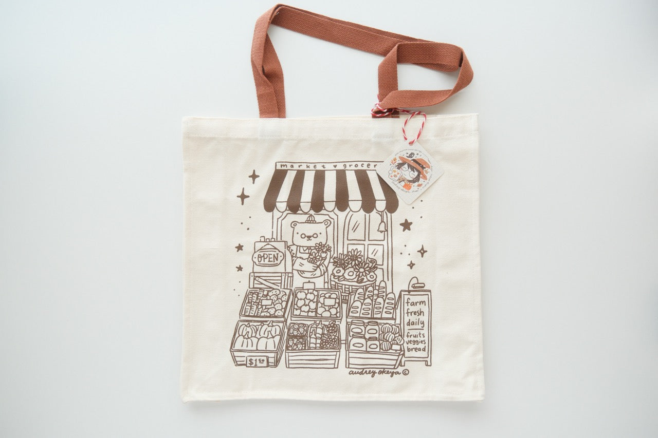 Designed by Audrey Okeya, this super cute tote features Mr. Bear running his local market! Made with thick canvas and a 2-inch gusset, it's sturdy and spacious—perfect for carrying all your daily essentials