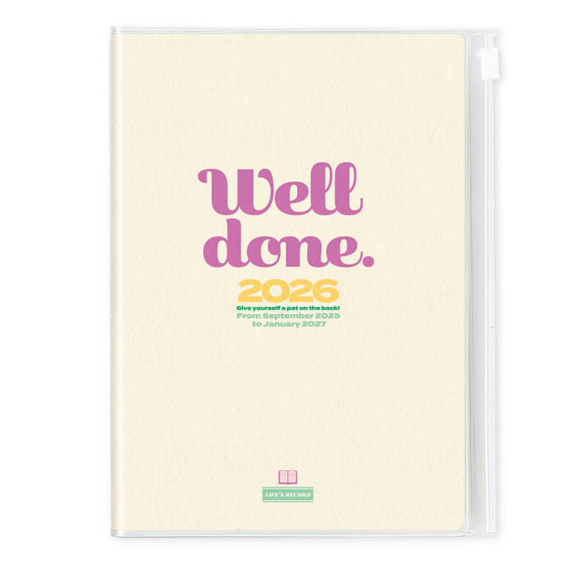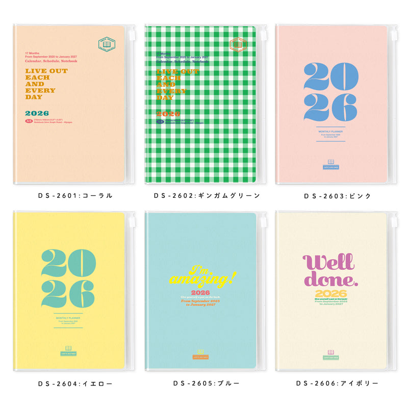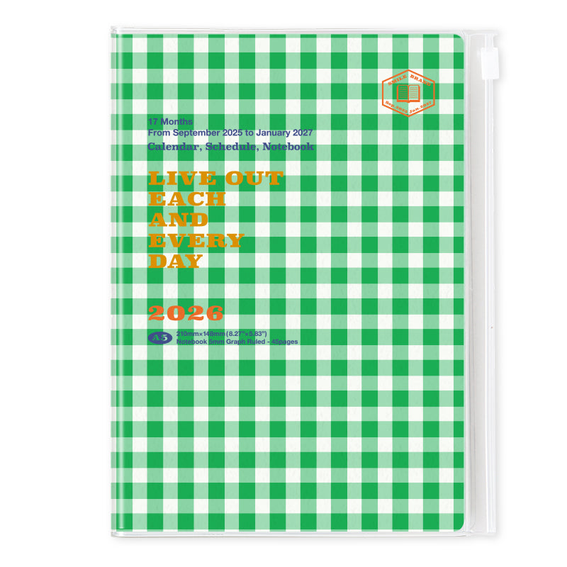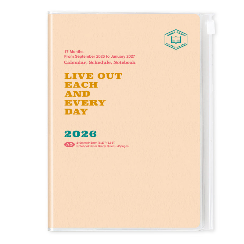 The monthly schedule pages span from September 2025 to January 2027. It also includes a bookmark and a cover with a sliding zipper to securely carry pens, stickers, or other small items. In total, it has 88 pages, making it perfect for organizing your days and keeping your essentials in one place.