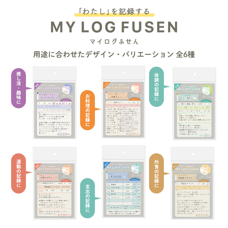Capture the “me” of everyday life with the My Log Fusen sticky note series by RYU-RYU. Perfect for recording daily experiences, events, and emotions, these sticky notes can be pasted on monthly pages, used as indexes, or combined with cards and illustrations in your notebook.